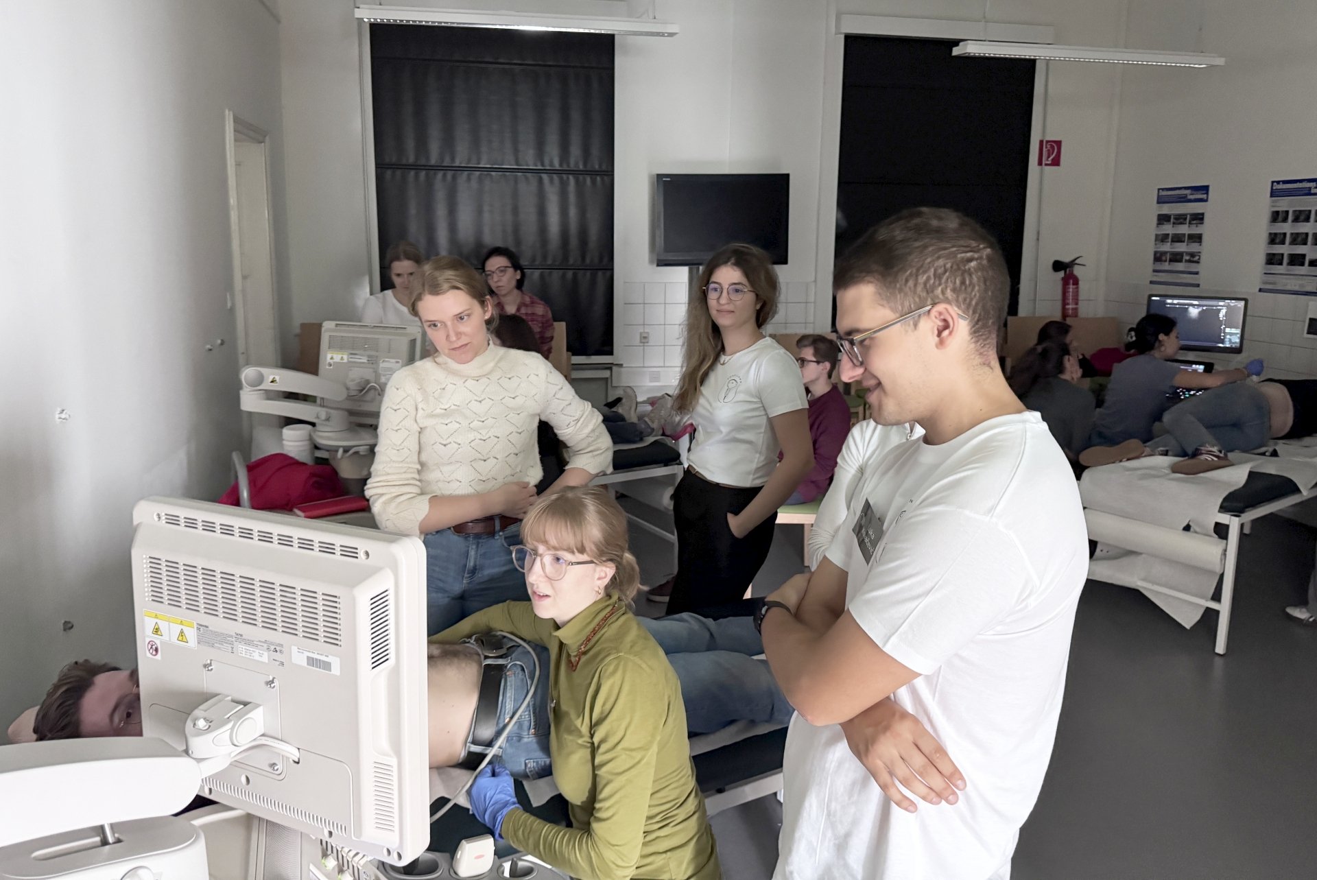 Studierende stehen um den Monitor eines Ultraschallgerätes